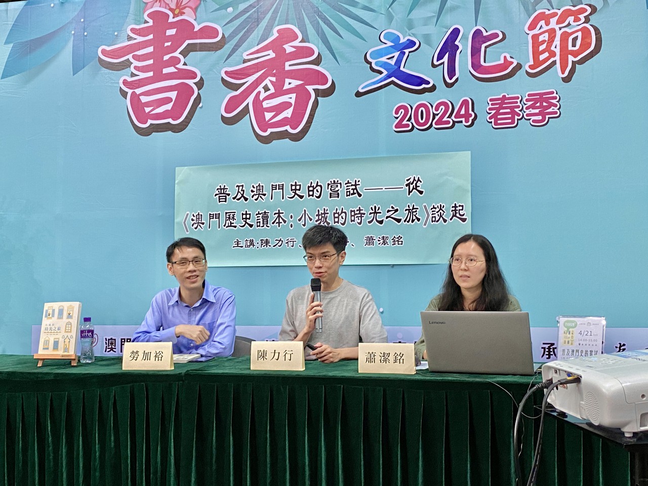 澳門基金會的“澳門記憶”文史網舉辦“普及澳門史的嘗試——從《小城的時光之旅》談起”座談會,已於4月21日在塔石體育館圓滿舉行,由青年學者陳力行、勞加裕及蕭潔銘主講,暢談普及澳門史的心路歷程。