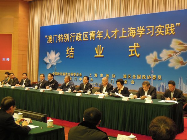 A Cerimónia de Encerramento do “Projecto de Estágio dos Jovens de Macau em Shanghai” teve lugar na sede da Conferência Consultiva Politica do Povo Chinês de Shanghai, no dia 12 de Dezembro, com a presença dos convidados de honra, nomeadamente, Ho Hau Wah, Vice-Presidente do Comité Nacional da Conferência Consultiva Politica do Povo Chinês (CCPPC), Fong Guoqin, Presidente do Comité de Shanghai da CCPPC, Yang Conghui, Sub-director do Comité de Hong Kong, Macau, Taiwan e Chineses Ultramarinos do CCPPC, Xu Ze, Sub-director do Gabinete de Ligação do Governo Central na RAEM, Liu Chak Wan, membro permanente do Comité Nacional da CCPPC e membro do Conselho de Curadores da Fundação Macau, Chui Sai Cheong, membro de Macau no Comité Nacional da CCPPC e Presidente do Conselho Fiscal da Fundação Macau e Wu Zhiliang, Presidente do Conselho de Administração da Fundação Macau. As entidades da organização reconheceram o sucesso e o bom aproveitamento dos jovens que fizeram parte do Projecto e esperam que os 28 formandos possam aproveitar os conhecimentos aprendidos neste Estágio em Shanghai nos seus trabalhos em Macau, injectando novas forças para o desenvolvimento da sociedade de Macau.