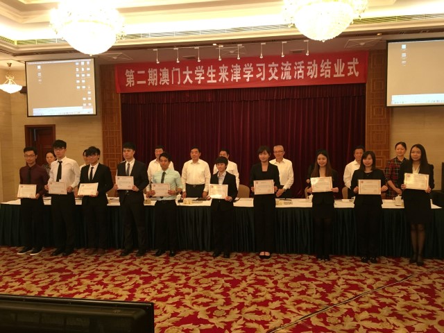 No dia 21 de Junho, a Cerimónia de Conclusão do “Projecto de Estudo e Intercâmbio dos Estudantes do Ensino Superior de Macau, 2016” teve lugar em Tianjin, contando com os formandos que concluíram o Projecto e também com a presença de um conjunto de ilustres convidados de honra, nomeadamente, Yang Chonghui, Membro Permanente e Membro do Conselho de Hong Kong, Macau, Taiwan e Chineses Ultramarinos da Comissão Nacional da CCPPC; Zang Xianpu, Presidente da Comissão Municipal de Tianjin da CCPPC; Xu Ze e Liu Chak Wan, Membros Permanentes da Comissão Nacional da CCPPC; Lv Hong, Sub-director do Conselho de Hong Kong, Macau, Taiwan e Chineses Ultramarinos da Comissão Nacional da CCPPC; Liang Hua, Sub-chefe do Conselho de Cultura, História e Estudos do da Comissão Nacional da CCPPC; Lam Kam Seng, Membro da Comissão Nacional da CCPPC; Liao Li, Sub-chefe do Departamento de Coordenação do Gabinete de Ligação do Governo Popular Central da RPC na RAEM; Zhong Yi Seabra de Mascarenhas, Membro do Conselho Administrativo da Fundação Macau; Zheng Zhiqiang, Membro Permanente da Comissão Municipal de Tianjin da CCPPC e Li Jinliang, Secretário-geral da Comissão Municipal de Tianjin da CCPPC, entre outras pessoas presentes. Os convidados de honra atribuíram os certificados de participação aos estudantes universitários de Macau que integraram o Projecto deste ano.
