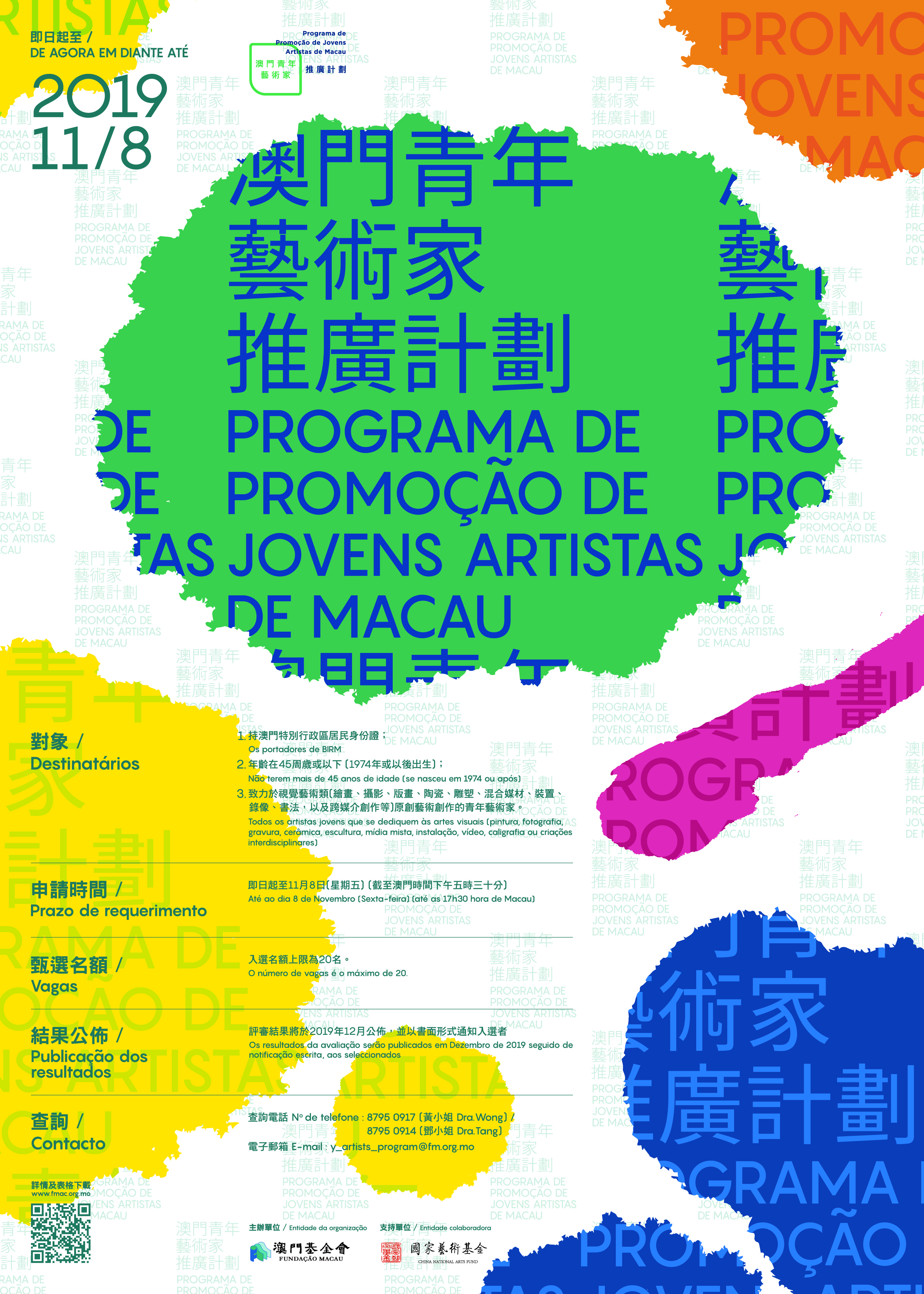 O regulamento e o formulário de candidatura ao “Programa de Promoção de Jovens Artistas de Macau, 2019” encontram-se disponíveis no website da Fundação Macau (www.fmac.org.mo). Todos os jovens artistas que reúnem os requisitos de candidatura são convidados a candidatar-se. Em caso de dúvidas, queira contactar a Sra. Wong ou a Sra. Tang através de telefone n.º 87950917 / 87950914, ou fax n.º 28727057 ou ainda por email: y_artists_program@fm.org.mo.