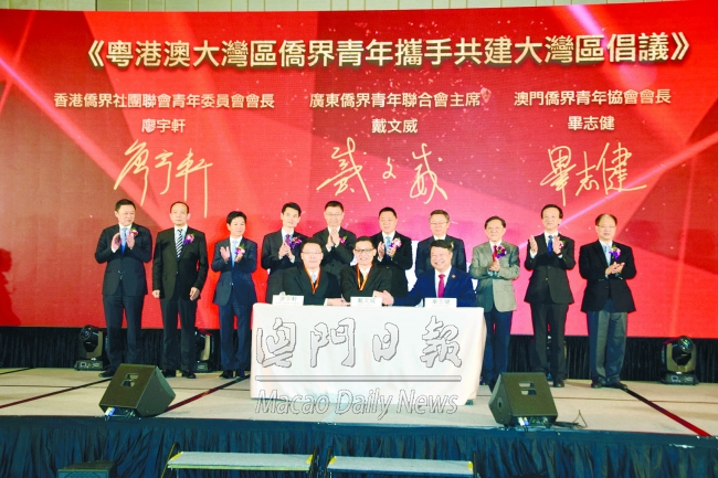 會上,香港僑界社團聯會青年委員會會長廖宇軒、廣東僑界青年聯合會主席戴文威和澳門僑界青年協會會長畢志健簽署了《粵港澳大灣區僑界青年攜手共建大灣區倡議》。